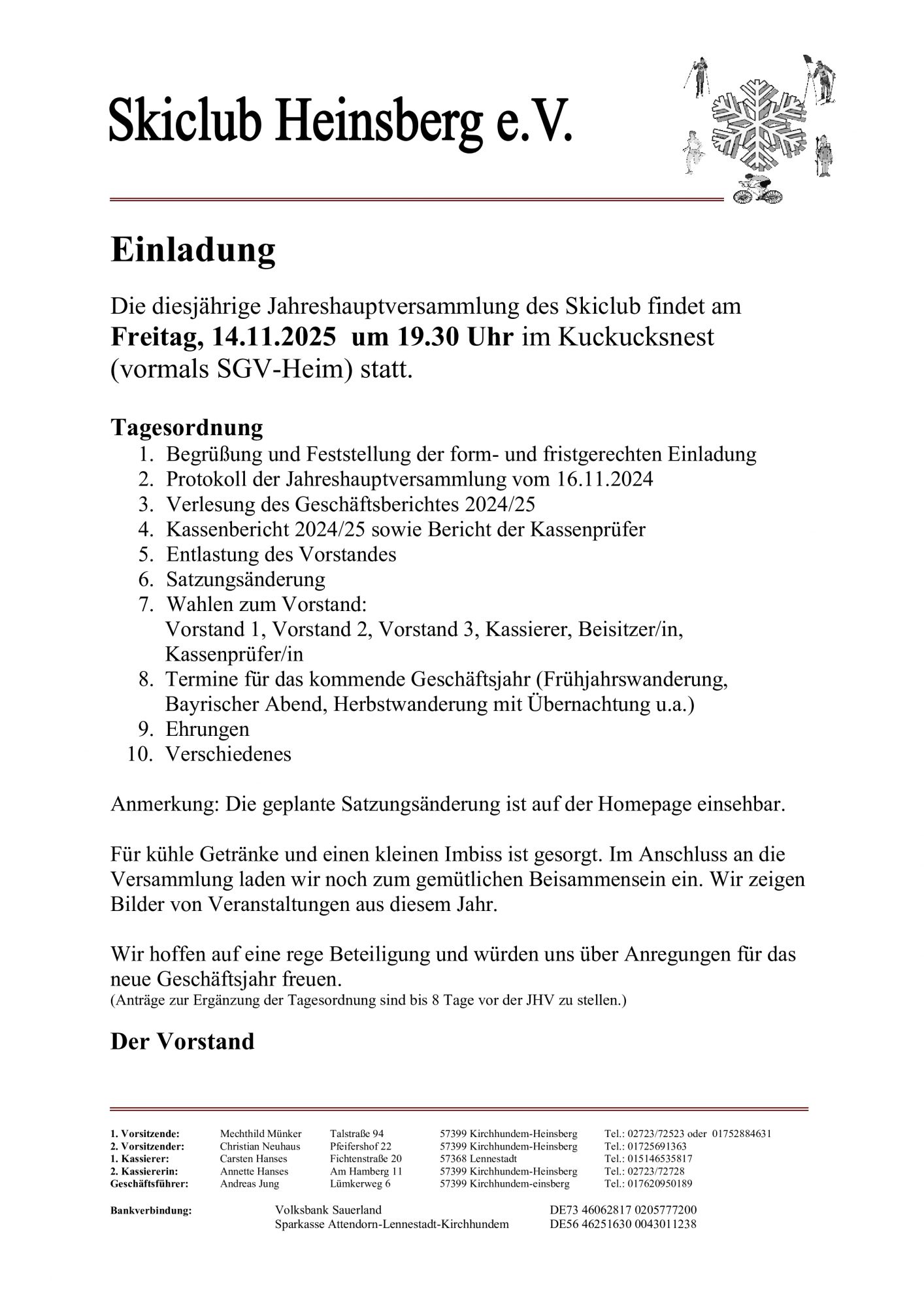 Der Skiclub Heinsberg lädt ein zur Jahreshauptversammlung am Freitag, den 14.11.2025 im „Kuckucksnest“ (ehem. SGV-Heim). Im Anschluss an die Versammlung findet ein gemütliches Beisammensein statt.